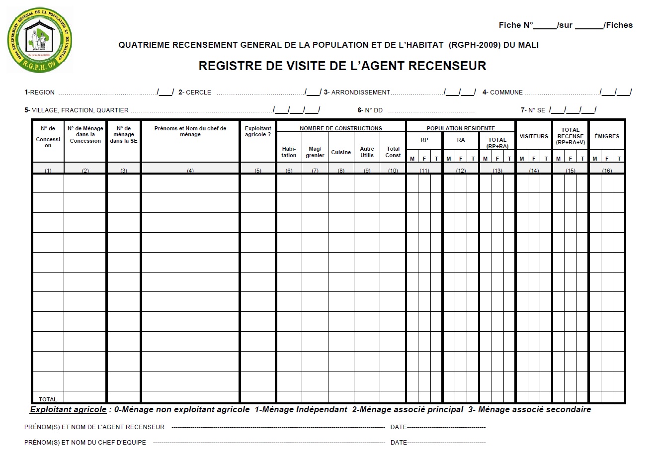 REGISTRE DE VISITE DE L’AGENT RECENSEUR