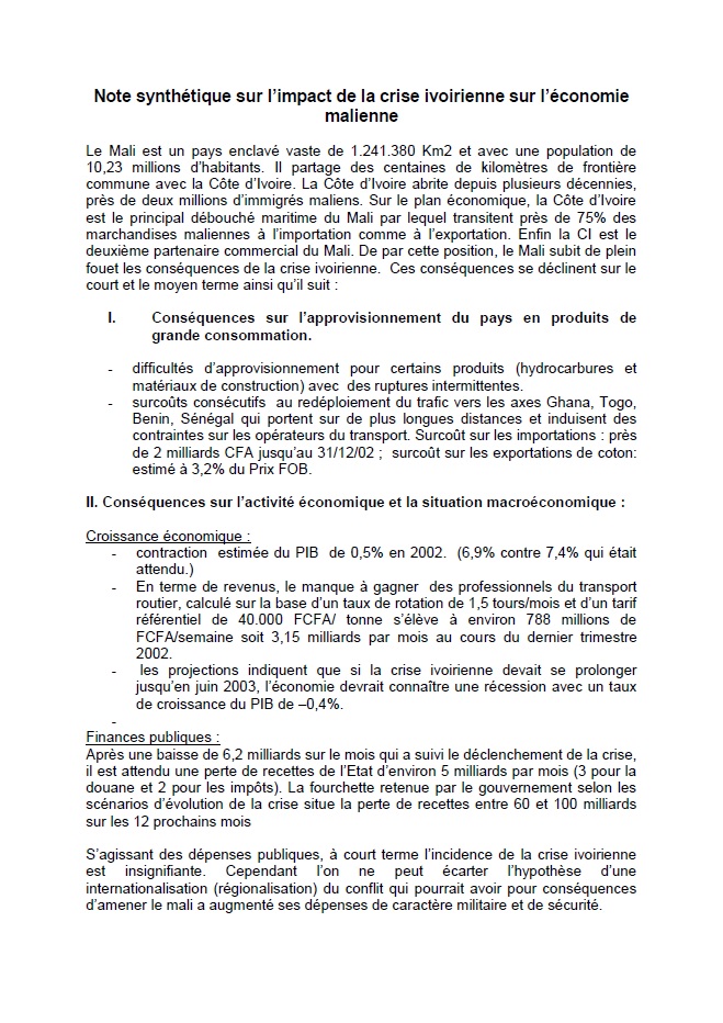 Le Mali est un pays enclavé vaste de 1.241.380 Km2 et avec une population de 10,23 millions d'habitants. Il partage des centaines de kilomètres de frontière commune avec la Côte d'Ivoire. La Côte d'Ivoire abrite depuis plusieurs décennies, près de deux millions d'immigrés maliens. Sur le plan économique, la Côte d'Ivoire est le principal débouché maritime du Mali par lequel transitent près de 75% des marchandises maliennes à l'importation comme à l'exportation. Enfin la CI est le deuxième partenaire commercial du Mali. De par cette position, le Mali subit de plein fouet les conséquences de la crise ivoirienne. Ces conséquences se déclinent sur le court et le moyen terme ainsi qu'il suit :