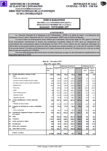 L’indice harmonisé des prix à la consommation (IHPC) du Mali est un indice de type Laspeyres qui couvre la