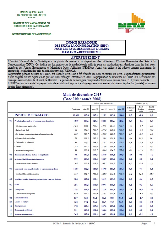 ménages résidant dans le District de Bamako. Le panier de la ménagère comprend 650 variétés suivies dans 1511 points de vente.