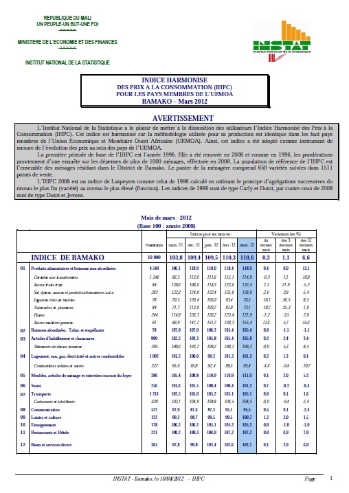 l’ensemble des ménages résidant dans le District de Bamako. Le panier de la ménagère comprend 650 variétés suivies dans 1511