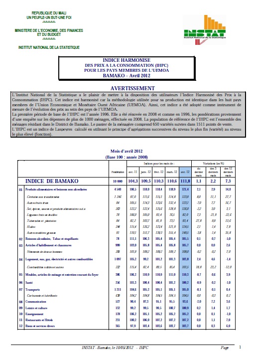 ménages résidant dans le District de Bamako. Le panier de la ménagère comprend 650 variétés suivies dans 1511 points de vente.