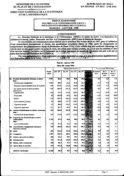 INDICE HARMONISE DES PRIX A LA CONSOMMATION (I.H.P.C.) POUR LES PAYS MEMBRES DE L'U.E.M.O.A. BAMAKO - JANVIER 1998