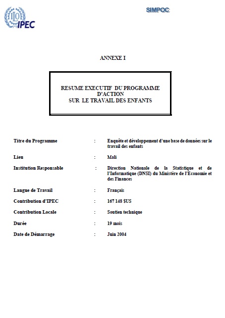 C'est dans ce cadre que le Gouvernement du Mali par le biais de la Direction Nationale de la Statistique et de l'Informatique (DNSI) envisage de mener en 2004 sur le terrain une enquête sur le travail des enfants.
