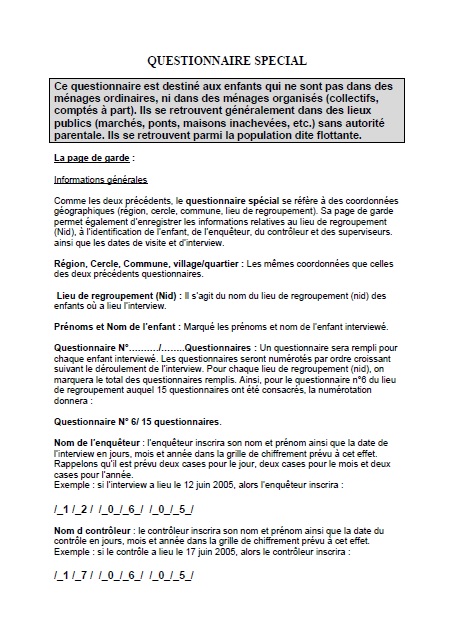 Ce questionnaire est destiné aux enfants qui ne sont pas dans des ménages ordinaires, ni dans des ménages organisés (collectifs, comptés à part). Ils se retrouvent généralement dans des lieux publics (marchés, ponts, maisons inachevées, etc.) sans autorité parentale. Ils se retrouvent parmi la population dite flottante.