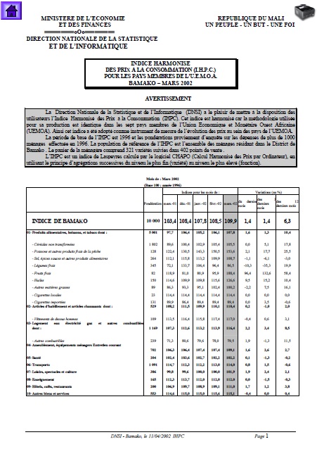 INDICE HARMONISE DES PRIX A LA CONSOMMATION (I.H.P.C.) POUR LES PAYS MEMBRES DE L'U.E.M.O.A. BAMAKO – MARS 2002