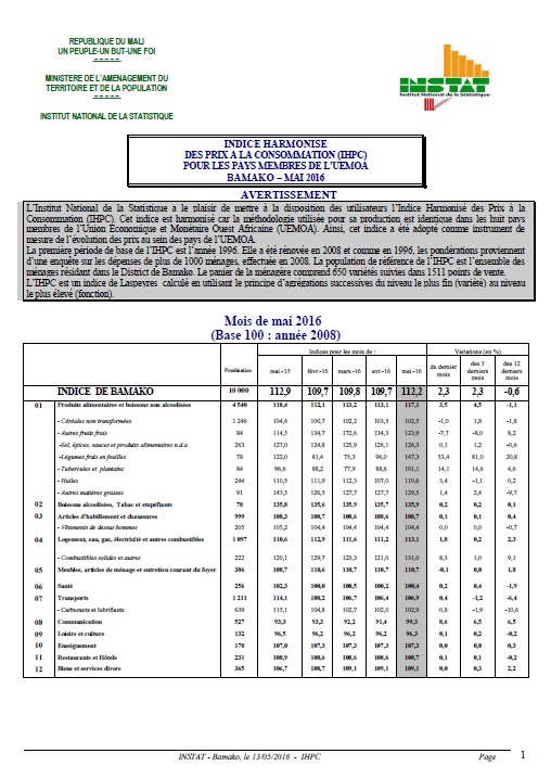 Institut National de la Statistique, Immeuble MEF, ACI 2000 (Avenue du Mali), BP : 12; Tel: 20 22 24 55 / 20 22 48 73, Site web : www.instat.gov.ml
