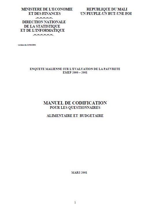 Ce manuel porte sur la codification des données figurant dans les différents tableaux des "Questionnaires Alimentaire et Budgétaire " de l'Enquête Malienne sur l'Evaluation de la Pauvreté (EMEP).