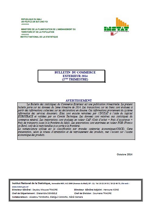 Institut National de la Statistique, Immeuble MEF, ACI 2000 (Avenue du Mali), BP : 12; Tel: 20 22 24 55 / 20 22 48 73, Site web :