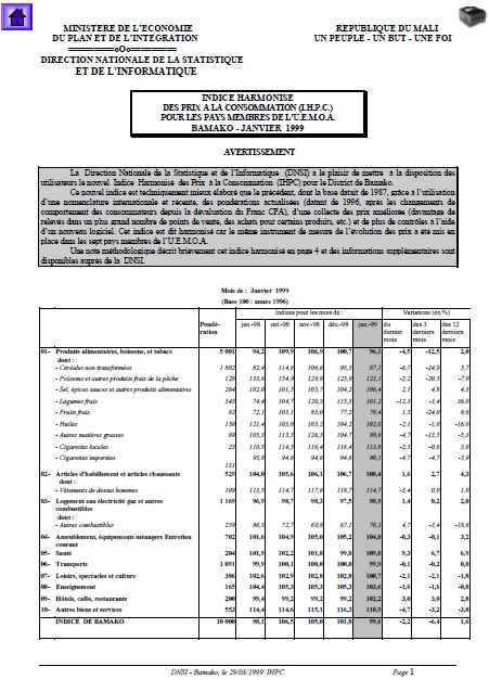 INDICE HARMONISE DES PRIX A LA CONSOMMATION (I.H.P.C.) POUR LES PAYS MEMBRES DE L'U.E.M.O.A. BAMAKO - JANVIER 1999