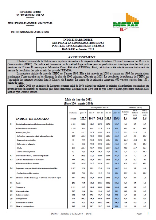 Institut National de la Statistique, Immeuble MEF, ACI 2000 (Rue du Mali), BP : 12; Tel: 20 22 24 55 / 20 22 48 73, Site web : www.instat.gov.ml