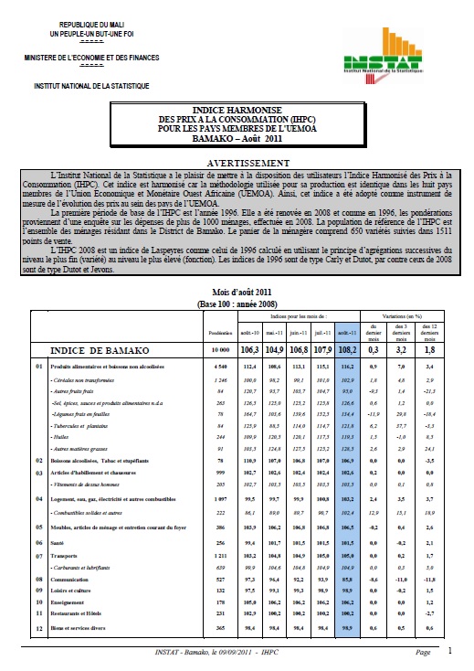 Institut National de la Statistique, Immeuble MEF, ACI 2000 (Avenue du Mali), BP : 12; Tel: 20 22 24 55 / 20 22 48 73, Site web : www.instat.gov.ml