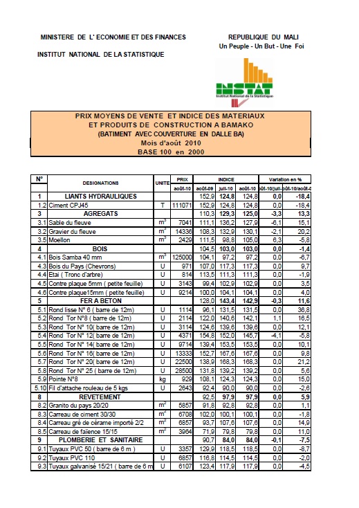 Au mois d'août 2010 le niveau de l'indice des matériaux et produits de construction est de 114,4
