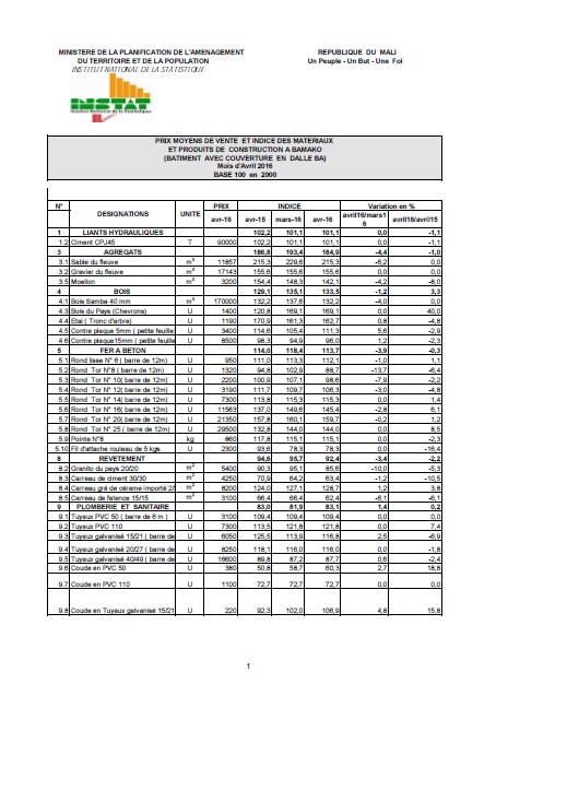 Au mois d'avril 2016 le niveau de l'indice des matériaux et produits de construction est de 117,8
