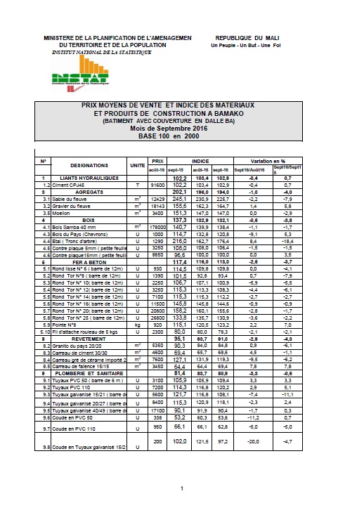 Au mois de Septembre2016 le niveau de l'indice des matériaux et produits de construction est de 119,2