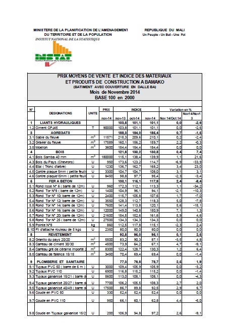 Au mois de Novembre 2014 le niveau de l'indice des matériaux et produits de construction est de 117,1