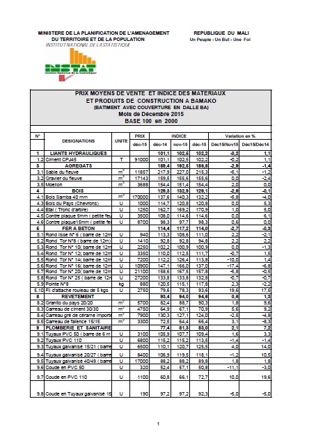 PRIX MOYENS DE VENTE ET INDICE DES MATERIAUX