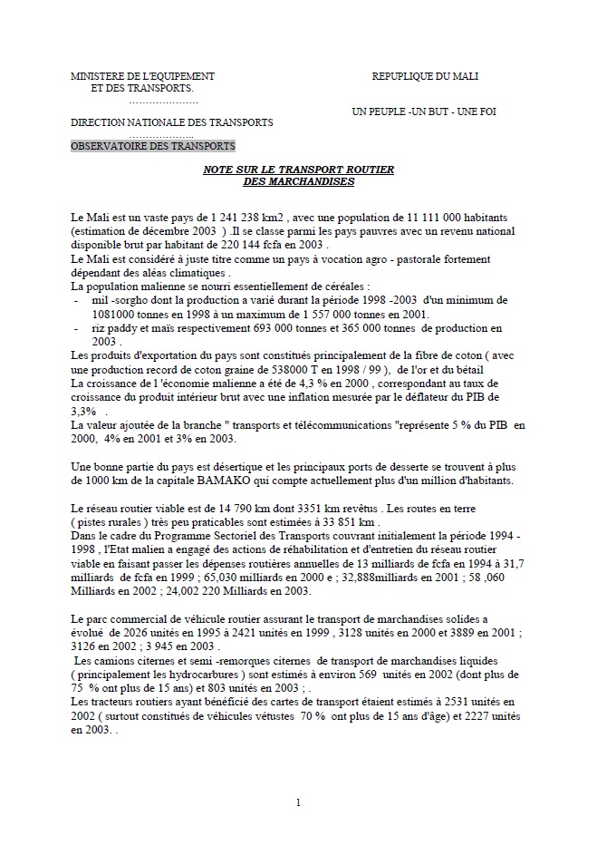 NOTE SUR LE TRANSPORT ROUTIER