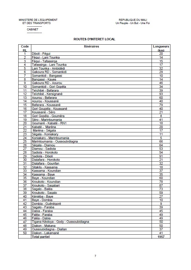 | 30 | Koulikoro – Fana – Dioïla – Massigui - Koualé – Kolondiéba – Kadiana – Fre RCI | 401 |