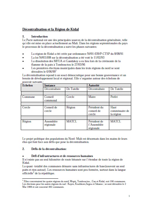Décentralisation et la Région de Kidal 1. Introduction Le Pacte national est une des... |