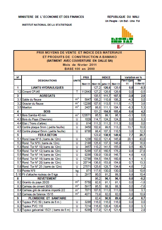 Au mois de fevrier 2011 le niveau de l'indice des matériaux et produits de construction est de 112,2