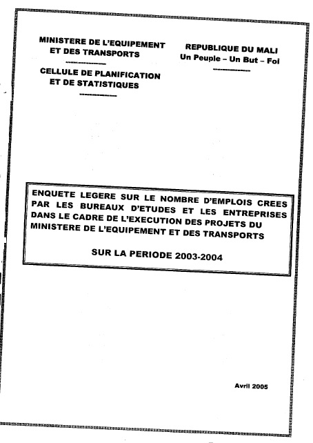 Enquête Légère Sur le Nombre d'Emplois Crées Par les Bureaux d'Etudes et les Entreprises Dans le Cadre de , l'Exécution des Projets Du Ministère de Transport et de l'Equipement et de Transport sur la Période 2003-2004